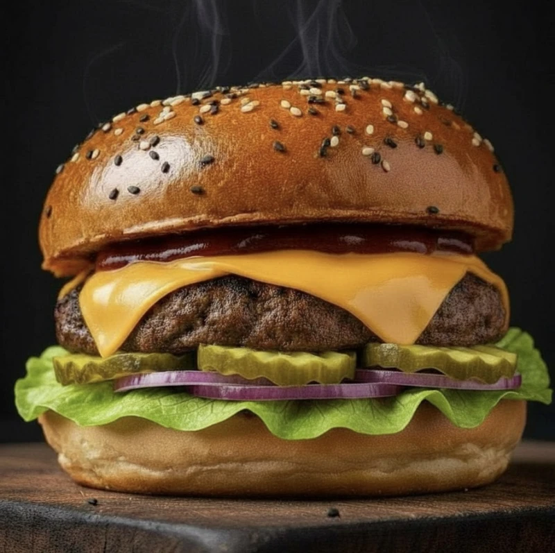 Булочка с кунжутом, говяжья котлета, сыр чеддер, соус фуди BBQ, салат айсберг, лук, маринованные огурцы.