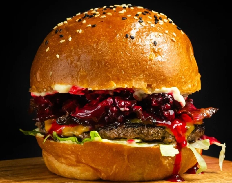 Булочка с кунжутом, говяжья котлета, соус вишнёвый, бекон, сыр чеддер, майонез, салат айсберг.