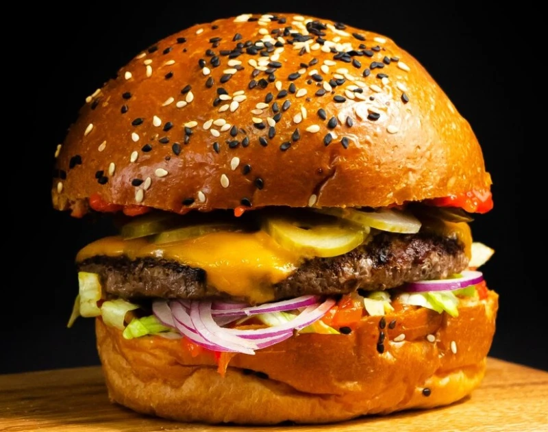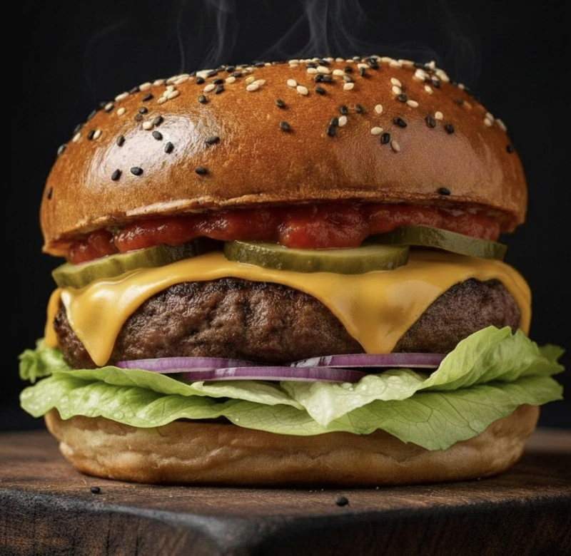 Булочка с кунжутом, говяжья котлета, соус сальса, салат айсберг, сыр чеддер, лук, маринованные огурцы.