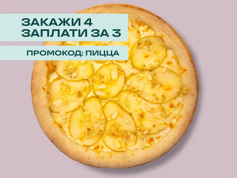 ФИРМЕННОЕ ТЕСТО, СОУС БЕШАМЕЛЬ, МОЦАРЕЛЛА, СЫР С ПЛЕСЕНЮ, ГРУША, САХАР ТРОСНИКОВЫЙ, ЛЕПЕСТКИ МИНДАЛЯ. 33см