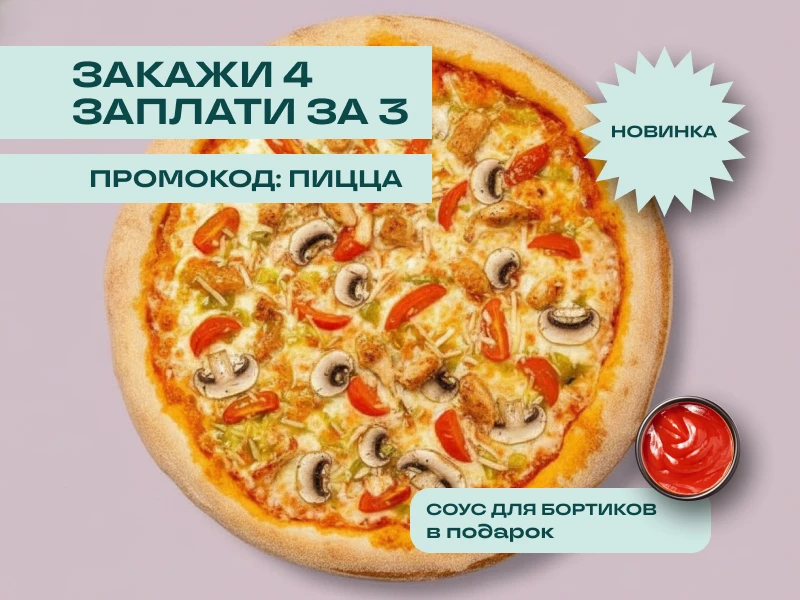 ФИРМЕННОЕ ТЕСТО, ТОМАТНЫЙ СОУС, МОЦАРЕЛЛА, КУРИНОЕ ФИЛЕ, ГРИБЫ ЖАРЕНЫЕ, ПАРМЕЗАН, ЧЕРРИ. 33см