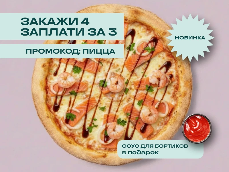 ФИРМЕННОЕ ТЕСТО, СОУС БЕШАМЕЛЬ, МОЦАРЕЛЛА, ФОРЕЛЬ, КАЛЬМАР, КРЕВЕТКА, СОУС ЛЕМОНГРАСС, РУККОЛА 33см