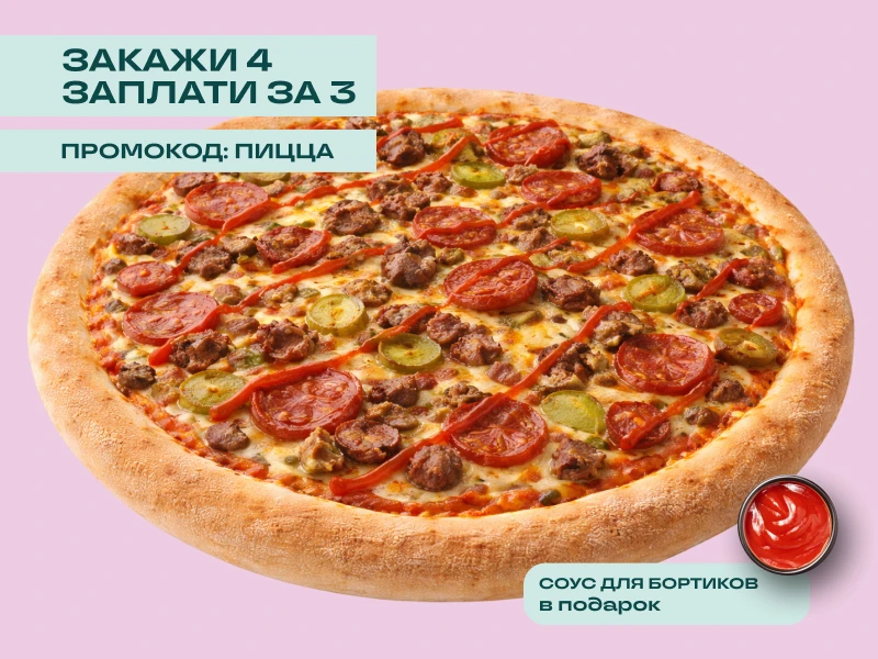 ФИРМЕННОЕ ТЕСТО, СОУС ТОМАТНЫЙ, ХАЛАПЕНЬО, СОУС ШРИРАЧА, МОЦАРЕЛЛА, ЧЕДДЕР, ЧОРИЗО, ОХОТНИЧЬИ КОЛБАСКИ, ГОВЯДИНА, ОГУРЦЫ МАРИНОВАННЫЕ, БОЛГАРСКИЙ ПЕРЕЦ. 33см