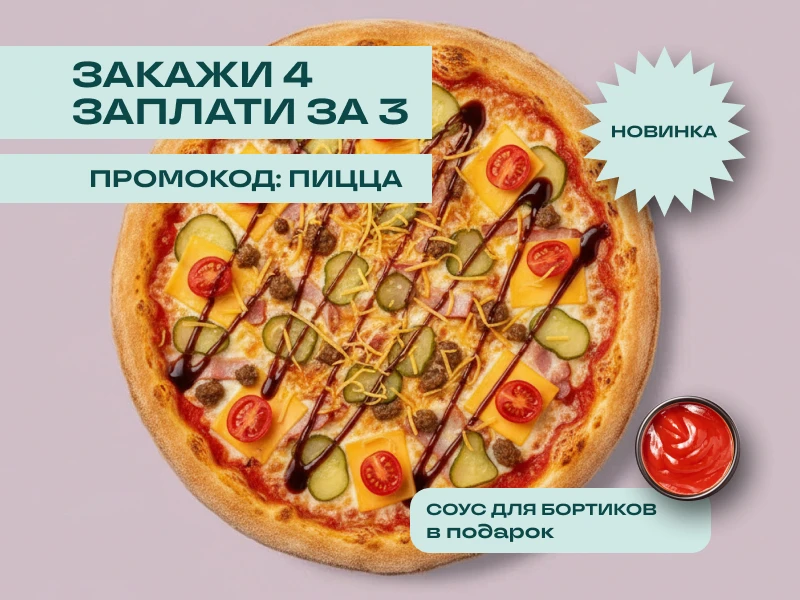 ФИРМЕННОЕ ТЕСТО, СОУС ТОМАТНЫЙ, МОЦАРЕЛЛА, ЧЕДДЕР, ФАРШ ГОВЯЖИЙ, БЕКОН, ОГУРЦЫ МАРИНОВАННЫЕ, ЧЕРРИ, СОУС УНАГИ. 33см