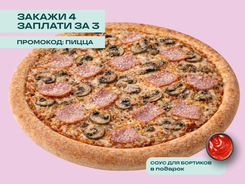 ФИРМЕННОЕ ТЕСТО, СОУС ТОМАТНЫЙ, МОЦАРЕЛЛА, ПАРМЕЗАН, ВЕТЧИНА ИЗ ИНДЕЙКИ, ГРИБЫ ЖАРЕНЫЕ ГРИБЫ. 33см