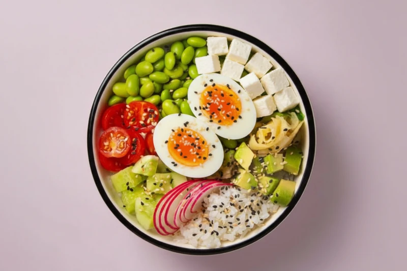 Яйцо куриное, Авокадо, Бобы Эдамаме, Огурцы в имбирном маринаде, Помидоры Черри, Имбирь, Редис, Кунжут, Брынза. Соус Ореховый Основа на выбор : Рис или Киноа.