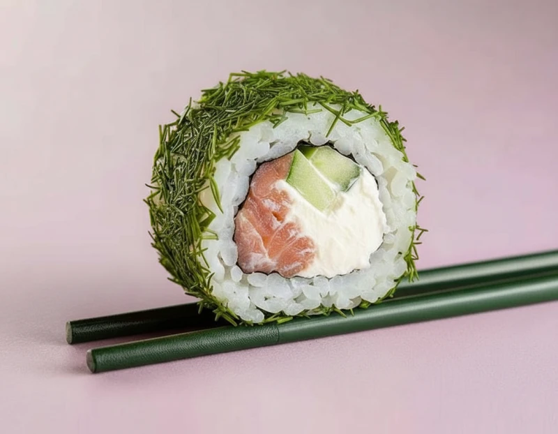 Нори, Рис, Сливочный Сыр, Лосось слабосослёный, Огурец, Укроп.