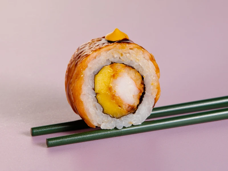 Нори, Рис, Креветка Темпура, Лосось, Манго, соус Спайси, соус Унаги. + СОЕВЫЙ СОУС 30мл НЕ ЯВЛЯЕТСЯ ГОРЯЧИМ БЛЮДОМ
