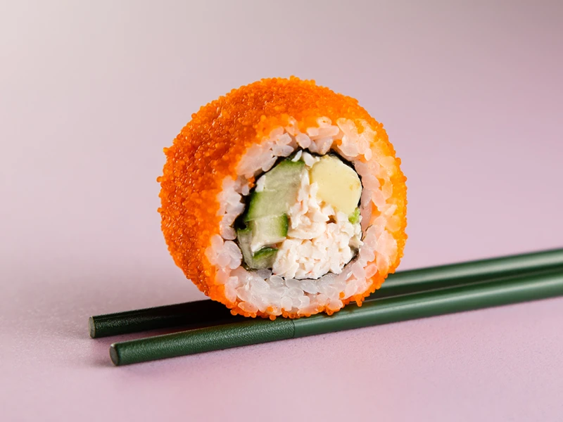 Нори, Рис, сливочный Краб, Огурец, Авокадо, икра Масаго. + СОЕВЫЙ СОУС 30мл